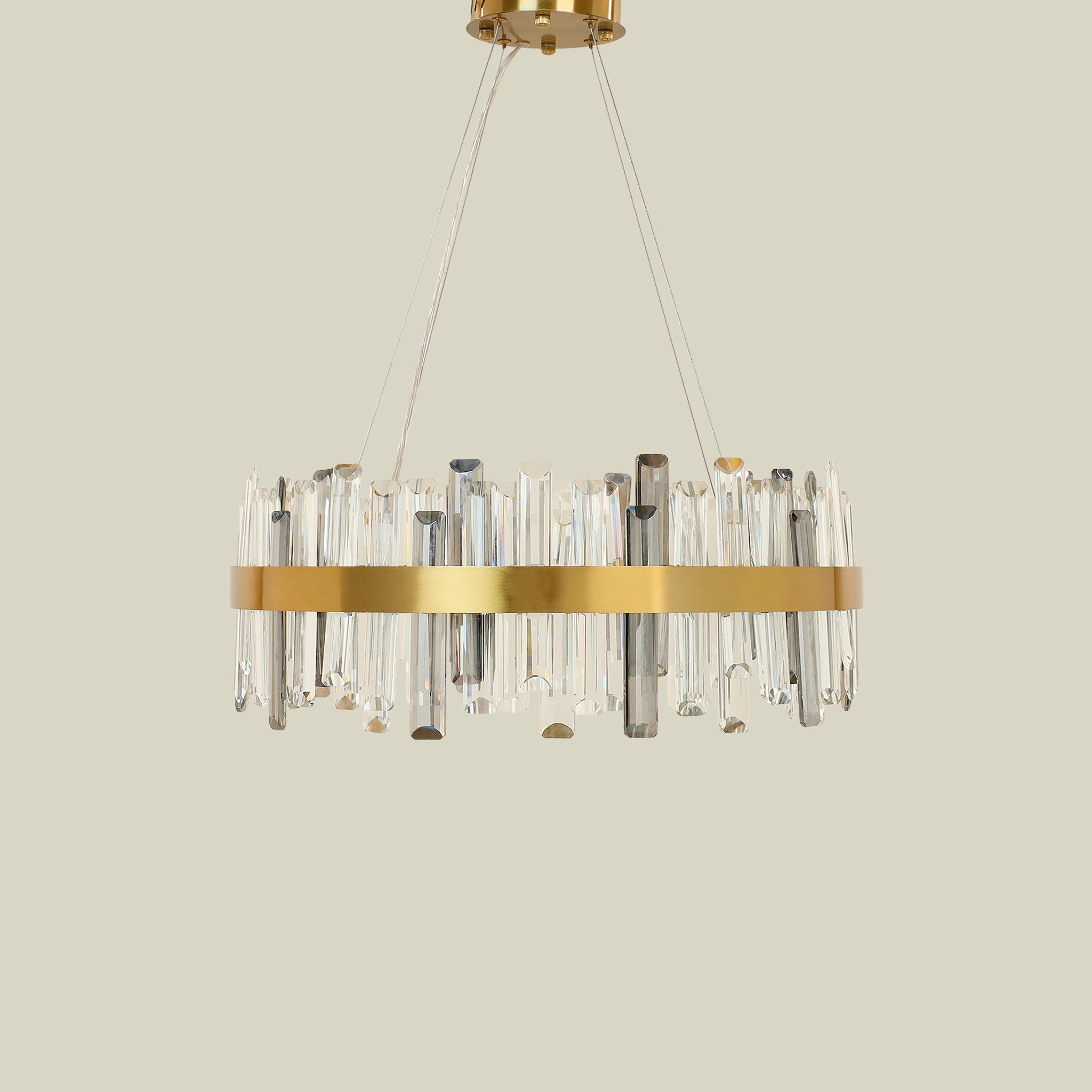 قم بترقية مساحة المعيشة الخاصة بك مع هذه الثريا الذهبية الرائعة، المصنوعة من الفولاذ المقاوم للصدأ والمزينة بالكريستالات المتلألئة.