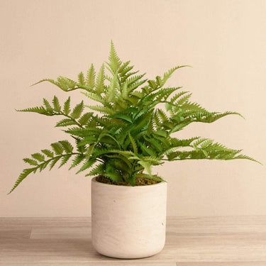 نبتة السرخس الصناعية من بلومر، داخل أصيص إسمنتي، لتجمع بين سحر الصحراء، وجمال النباتات الطبيعية، في تصميم عصري خلاب. يمكنك وضع هذه التشكيلة على حافة النافذة أو على طاولة جانبية لمظهر رائع يزيد من أناقة منزلك، ويدوم طويلاً دون حاجة للعناية المستمرة.