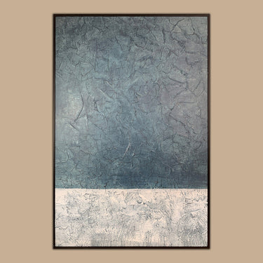 ارتقِ بذوقك الفني مع هذه القطعة المعاصرة التي تجذب الأنظار بتصميمها العصري، ممزوجة بأناقة من درجات الأزرق والرمادي. يوفر القماش سطحًا جذابًا للحرفية المميزة وتلوين الملمس الطبيعي المتصدع، مما يضفي إحساسًا بالعمق ضمن لوحة الألوان الهادئة.