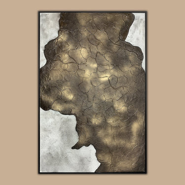 عزّز جمالك مع هذه التحفة الفنية بدون إطار. أشكال تجريدية بصفائح معدنية سائلة وتكديس نسيج الحجر الرملي تُضفي مشهدًا ديناميكيًا، فنّانًا معاصرًا آسرًا بعمقه الملموس.