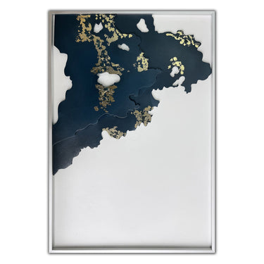 قم بتعزيز جمالك مع هذا فضي عمل فني مؤطر. القماش مفعم بالحياة بفضل تكديس الألواح والرسم والرقائق المعدنية الجزئية، مما يخلق مشهدًا بصريًا ديناميكيًا، فنًا معاصرًا آسرًا بعمقه وتكوينه.