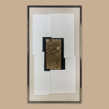 عزز جمالية ديكورك مع هذه القطعة الفنية المؤطرة باللونين الأسود والذهبي. تتجلى الحياة في التكوين من خلال النقش على الخشب، وتشكيل زجاج البحر، والطلاء، وقاعدة من القماش، لتخلق رؤية بصرية ديناميكية تترجم إلى عمل فني معاصر يأسر الأنظار بعمقه وتركيبه.