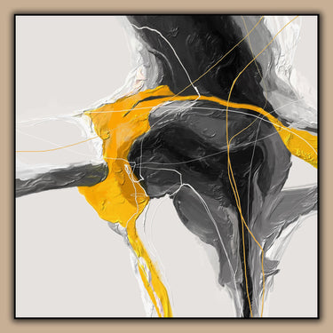 هذا العمل العصري يبرز بين الحشود. مستوحى من ستينيات القرن الماضي، يتميز بجرأة وألوان زاهية مع لمسة عصرية. الألوان الحيادية من الأسود والأبيض تضفي عمقًا وتباينًا على القطعة الفنية، بينما يضيف اللون الأصفر بيانًا جريئًا يلفت الانتباه في أي غرفة.