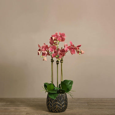 أضف حياة طويلة الأمد إلى منزلك مع هذه الأوركيد الجميلة. مصنوعة يدويًا من قبل بائعي الزهور الخبراء بتقنية اللمس الحقيقي ، تبدو هذه الأوركيد وكأنها نابضة بالحياة تمامًا. يتناسب وعاءهم الأسود والذهبي الأنيق المزين بأوراق الشجر مع أي ديكور.