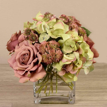 تشكيلة زهور صناعية متنوعة في مزهرية زجاجية