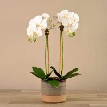 أنيقة وبسيطة. مصنوع يدويًا باستخدام تقنية اللمس الحقيقي ، يبدو هذا الترتيب السحري المذهل ويشعر بأنه حقيقي بشكل لا يصدق. إن وعاءها العصري ذو اللونين يكمل تمامًا بتلات الحرير والأوراق الخضراء المورقة.