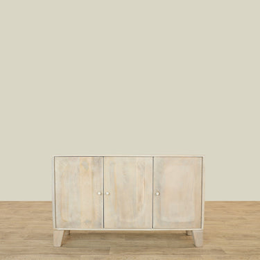 تتميز هذه الخزانة الجانبية الخشبية الأنيقة بتصميم لوحة منحوتة بشكل جميل وثلاثة أبواب بمفصلات، مما يوفر الأناقة والوظيفة.