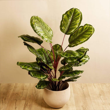 رمز البدايات الجديدة. نبتة كالاتيا الصناعية هذه ستمنحك نظرة جديدة وعصرية للحياة. تتميز بالمظهر الطبيعي لأوراقها الخضراء السميكة التي تزينها خطوط عرضية وفروعها الحمراء الزاهية. تصلك النبتة جاهزة لتزيين منزلك، كل ما عليك هو ثني فروعها للخارج حتى تصل للحجم الذي تفضله ووضعها في أصيص عصري من اختيارك ليكتمل رونقها.
