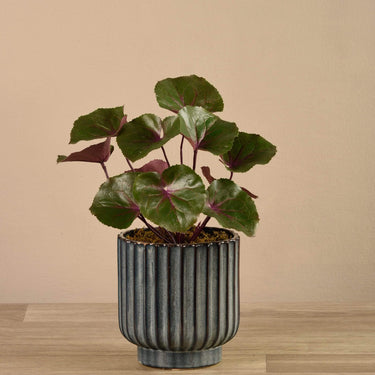 Add a homey touch to your bookshelf with this artificial ligularia plant. Its lush green and red leaves contrast beautifully against the textured grey pot.