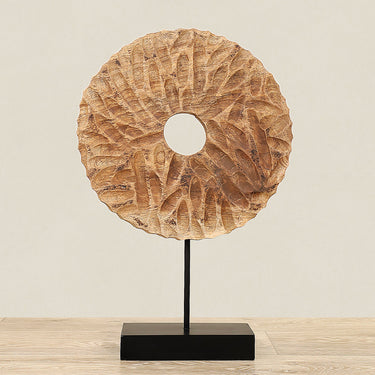 Resting on a sleek black iron stand, the Chiseled Wheel creates a striking visual contrast between the earthy warmth of the wood and the modern, minimalist design of the stand. This combination of materials adds a sophisticated edge to the sculpture, making it a versatile addition to any decor style, from contemporary to rustic and eclectic.