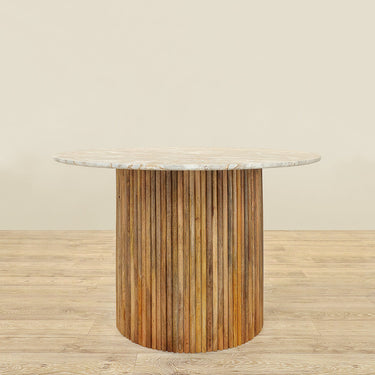 Meet the Wilma Dining Table, a stunning centerpiece for your dining area. This exquisite table features a chocolate marble top that exudes sophistication. The round surface is perfect for gatherings and family meals. The pedestal base showcases intricate vertical wooden detailing, adding a touch of contemporary charm to its modern design. The Wilma Dining Table seamlessly blends classic materials with a sleek, modern aesthetic, making it a stylish and functional addition to any home.