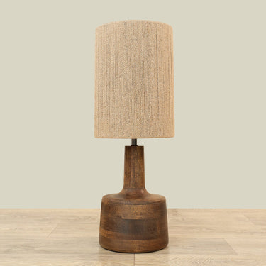 This refined table lamp merges natural materials with elegant design, featuring intricately wound rope detailing that wraps around a warm light brown wooden base.