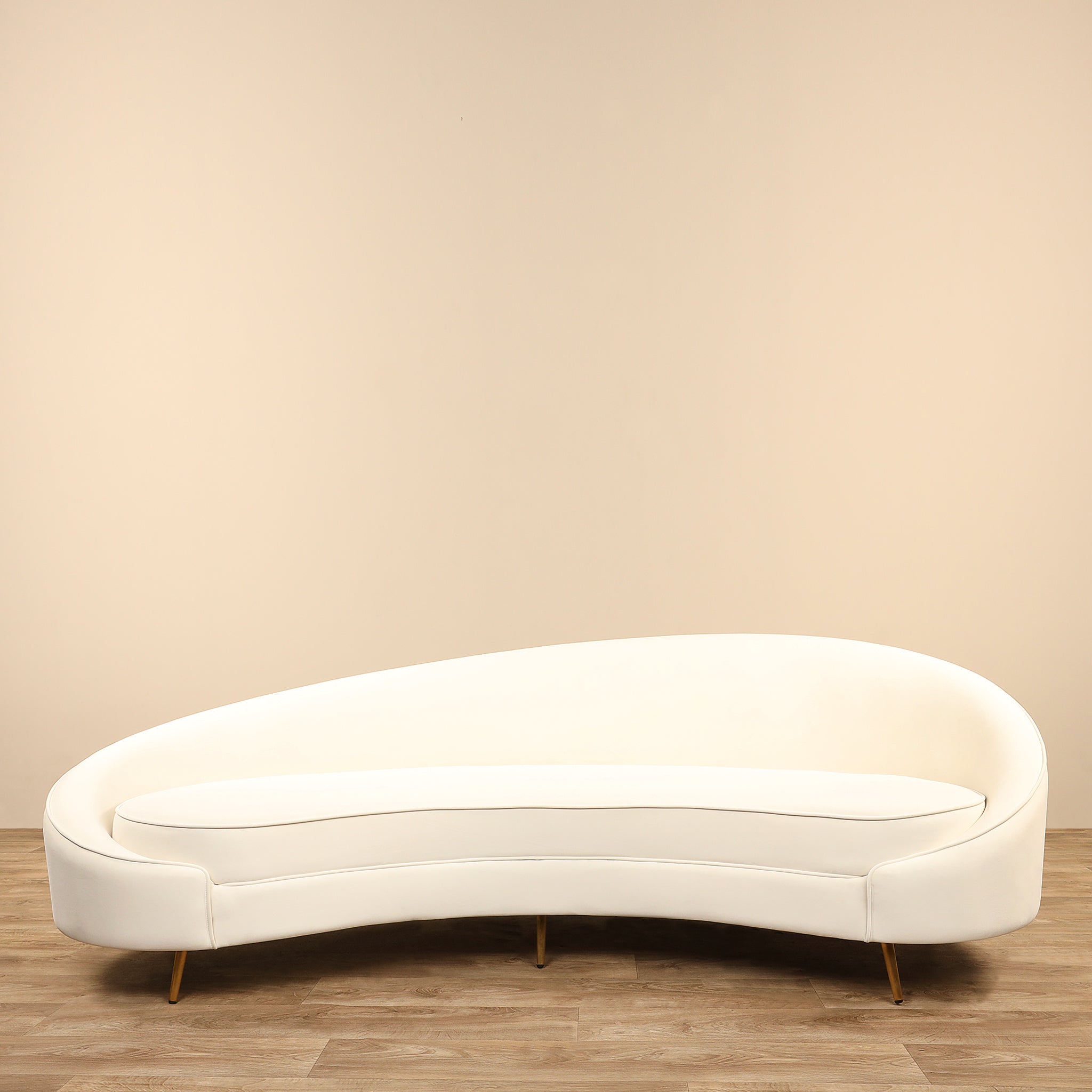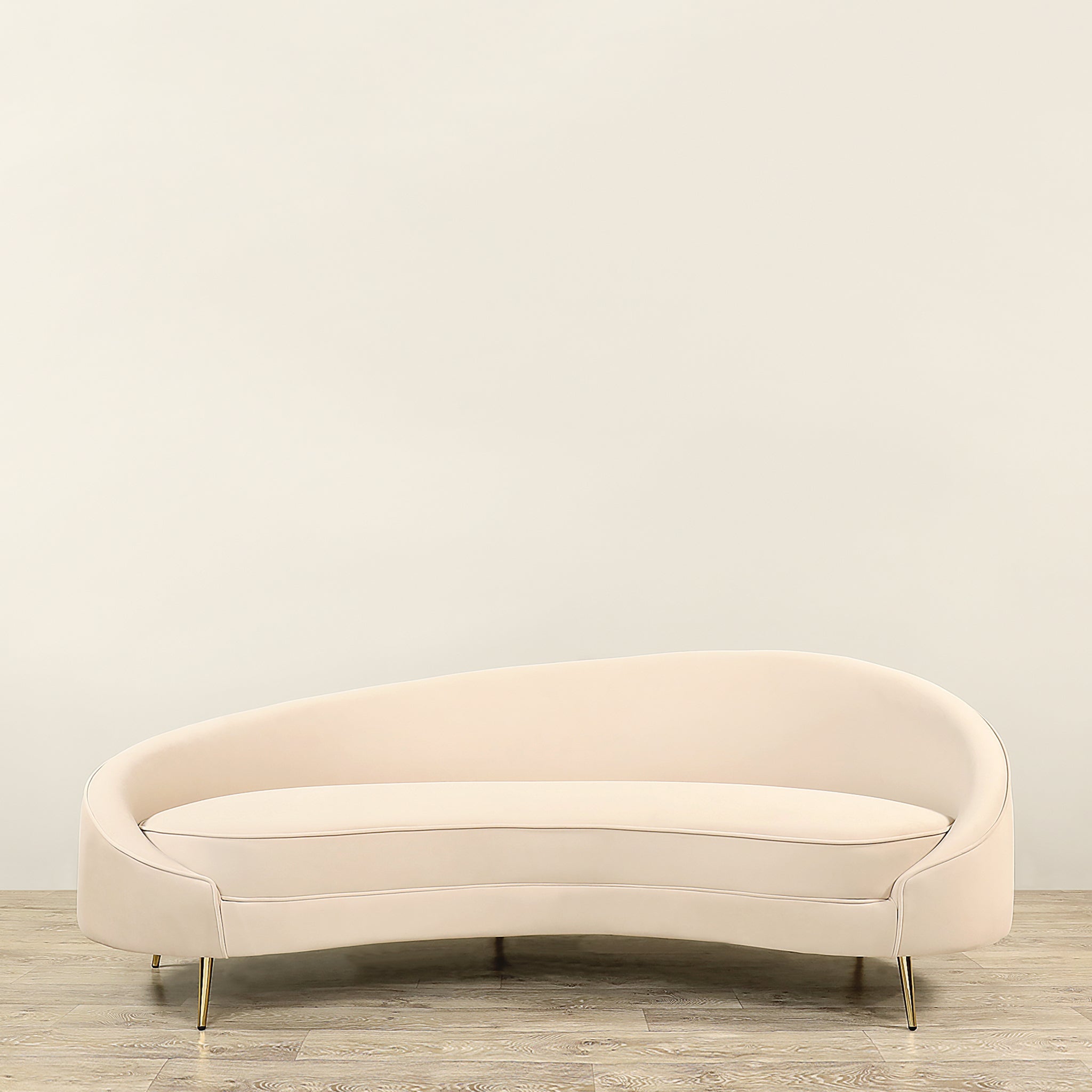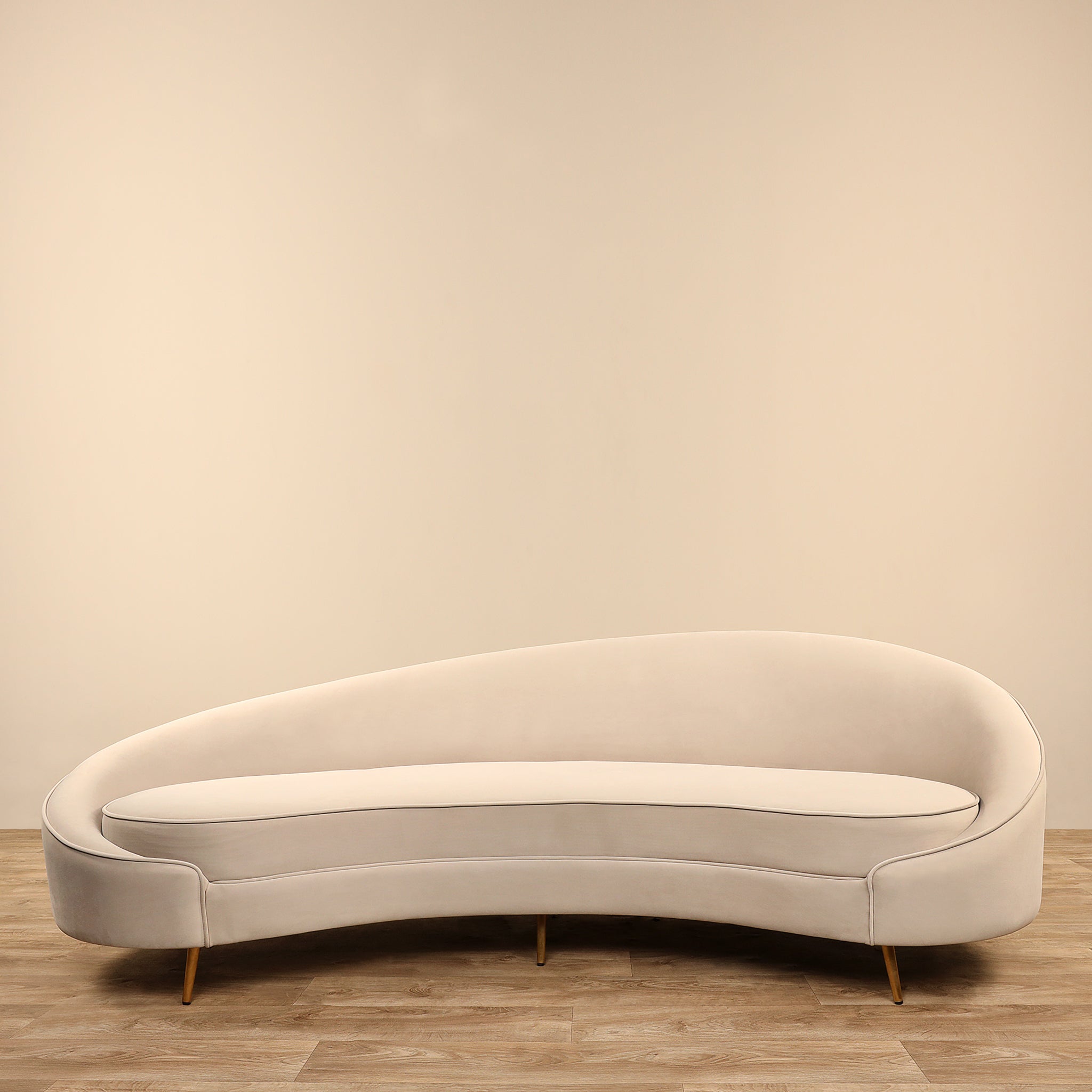 The Jace Sofa boasts sleek, flowing lines and a textured bouclé fabric that together create an elegant and captivating silhouette. This modern sofa is visually appealing from all perspectives and is elevated by its Mid-Century Modern legs, adding a hint of stylish flair.