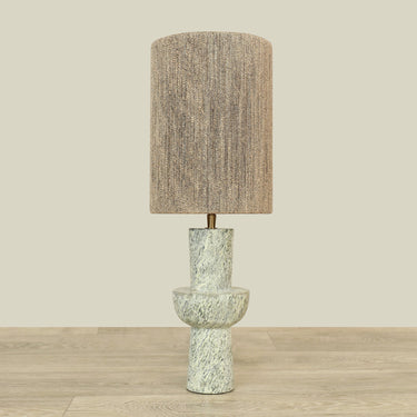 This elegant table lamp merges artisanal craftsmanship with contemporary design, showcasing a meticulously wound black natural rope shade paired with a verdant marble base.