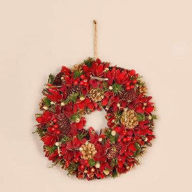 'Tis the season for hanging beautiful wreaths like this one on your front door. Featuring faux pinecones, poinsettias, and cranberries, this glittering red wreath is sure to invite the holiday spirit.