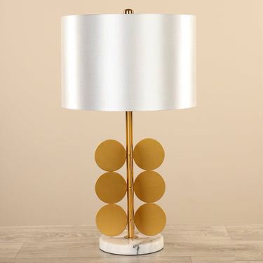 Infuse any space with radiance using our sophisticated Marble Table Lamp. Crafted with a solid marble base that exudes both stability and a touch of luxury, this lamp features a sleek body adorned with pure mid-century modern bronze-finished discs. The lamp's contemporary aesthetic is elegantly crowned with a smooth, satin-finished drum shade, dispersing light to provide illumination for your living room, entry or bedroom.