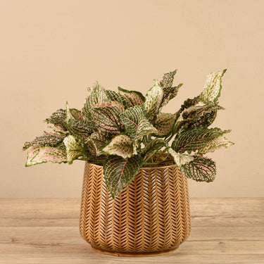 This understated artificial fittonia plant instantly elevates any shelf or dresser, offering the look of a real plant without any of the maintenance. Its brown textured pot contrasts beautifully with the white and green leaves.