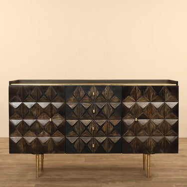 Dark wood contrasts beautifully with gleaming gold accents on this Wooden Sideboard. Crafted with a diamond design on the door fronts, this Cabinet has a metal base and handles for brilliant interest. Enjoy contemporary style and gorgeous storage with this handsome Wooden Sideboard.
