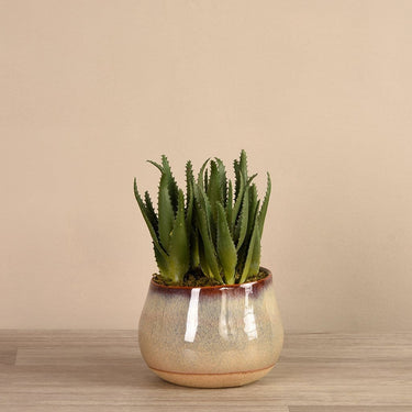 تشكيلة نبات الألوفيرا الصناعي من بلومر بتصميم مستوحى من سحر صحراء سانتا فيه تزيد من بريق منزلك لأجواء صيفية مثالية، مع أوراق الألوفيرا الحريرية التي تبدو طبيعية تماماً بلونها الأخضر الزاهي، والمزهرية السيراميكية باللون الرمادي. يمكنك وضع هذه التشكيلة عى حافة نافذتك المفضلة أو في غرفة المعيشة لتخلق هالة من الدفء والراحة. جميع نباتاتنا الصناعية تصنع من أجود الخامات على أيدي منسقي زهور متخصصين.