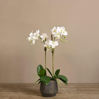 يلتقي الغريب بالكلاسيكية. تبدو هذه الأوركيد الاصطناعية المذهلة نابضة بالحياة بشكل ملحوظ بفضل تقنية اللمس الحقيقي. الوعاء الرمادي والذهبي المتلألئ بهدوء يكمل بشكل جميل الأوراق الخضراء والزهور الرائعة.