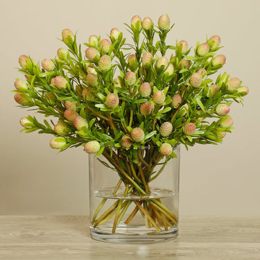 تنسيق زهور البروتيا الاصطناعية في مزهرية زجاجية