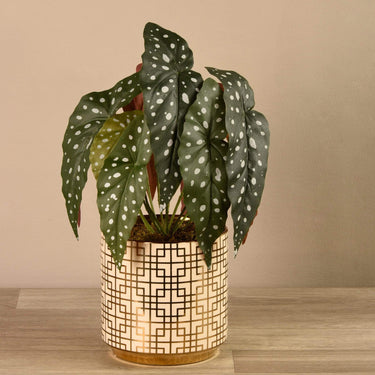 نبتة بيغونيا مرقطة صناعية في أصيص أبيض وذهبي