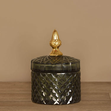 تخيل هذا الصندوق الزجاجي الأنيق في غرفة الضيوف أو الصالة لحفظ الحلي والأشياء الصغيرة. يتميز هذا الصندوق الدائري بتصميمه الزجاجي الجميل الذي يعكس الضوء، وغطائه بمقبض ذهبي أنيق لسهولة الوصول إلى محتوياته.