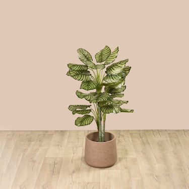 رمز البدايات الجديدة. شجرة كالاتيا الصناعية هذه ستمنحك نظرة جديدة وعصرية للحياة، وهي تتميز بالمظهر الطبيعي لأوراقها الخضراء السميكة التي تزينها خطوط عرضية. تصلك الشجرة جاهزة لتزيين منزلك، كل ما عليك هو ثني فروعها للخارج حتى تصل للحجم الذي تفضله ووضعها في أصيص عصري من اختيارك ليكتمل رونقها.