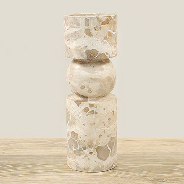 حامل الشموع الرخامي الرائع لدينا، قطعة مركزية خلابة تضفي جمالاً، وتشطيبها اليدوي يُضفي لمسةً من السحر الحرفي. عروقه الجميلة وتصميمه الأنيق يجعلانه قطعةً متعددة الاستخدامات تُكمل مجموعةً متنوعةً من أنماط الديكور الداخلي، من الأناقة الساحلية إلى الأناقة العصرية.