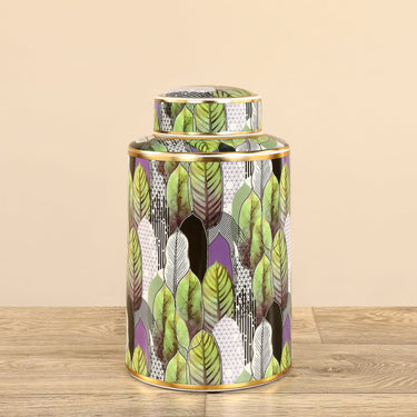 يضفي تصميم الجرة الكلاسيكي لمسة عصرية بطبعة عصرية وحواف ذهبية لامعة. مثالية للعرض على رف أو رف مدفأة، كما يمكن استخدامها كمزهرية لباقة زهور.