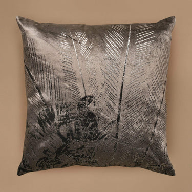 أضف لمسة من النعومة إلى غرفة الجلوس الخاصة بك مع هذه الوسادة ذات اللون الفضي. إن نمط الخاري الأسود ورقائق الذهب المتربة، والسحاب المغطى القوي، والملمس المخملي يجعلها إضافة مثالية إلى ركنتك.