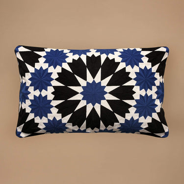 أضف لمسة أنيقة إلى أي منطقة جلوس مع هذه الوسادة المستطيلة الشكل. إن نمطها الهندسي الأبيض والأسود والكحلي، والسحاب المغطى القوي ، والملمس الناعم يجعله إضافة مثالية إلى ركنتك.