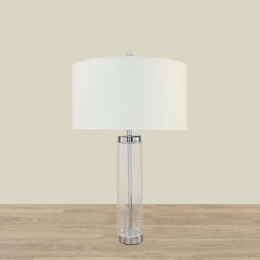 This elegant glass table lamp combines chrome metalwork with pristine glass elements to create a statement piece for discerning interiors.