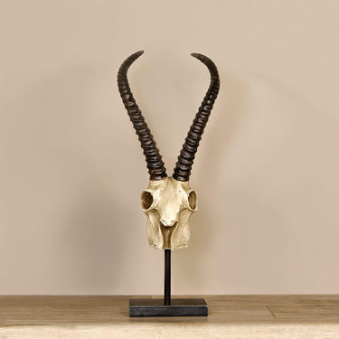 تصميم فريد يجمع بين السحر الريفي والذوق الرفيع. قطعة الديكور هذه تترك انطباعًا لا يُنسى على أي مكان، مع تصميم على شكل جمجمة تيس بمظهر طبيعي تمامًا، مثبتة على حامل أسود معدني متين.