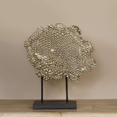 تصميم عصري أنيق بطعم حلو. قطعة ديكور على شكل خلية نحل معدنية بنقوش سداسية محفورة بعناية بالغة، مع قاعدة معدنية سوداء متينة.