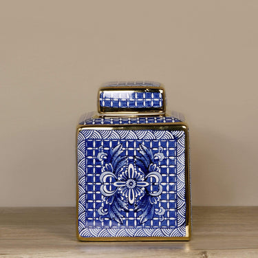 الفخامة والأصالة. تتميز هذه الجرة بزخارف شرقية باللونين الأزرق والأبيض، مع لمسات ذهبية أنيقة وغطاء قابل للإزالة لاستخدامها في أغراض التخزين.