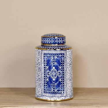 الفخامة والأصالة. تتميز هذه الجرة بزخارف شرقية باللونين الأزرق والأبيض، مع لمسات ذهبية أنيقة وغطاء قابل للإزالة لاستخدامها في أغراض التخزين.