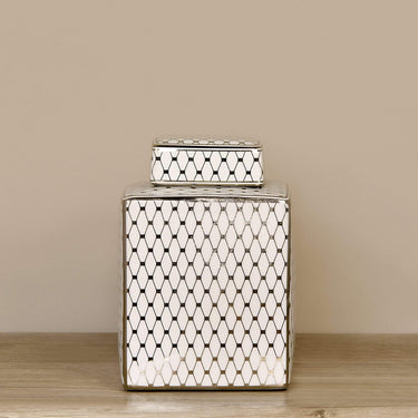 أنيقة وبسيطة. تتميز هذه الجرة بزخارف شبكية هادئة، باللونين الفضي والأبيض الناصع، كما تأتيك بغطاء قابل للإزالة لاستخدامها في أغراض تخزين بكل سهولة.