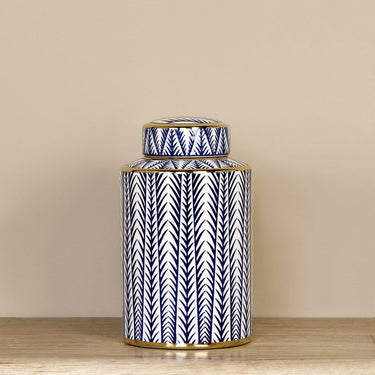 جرة فريدة تجمع بين العصرية وسحر الطبيعة. تعتبر هذه الجرة إضافة مثالية للمطبخ أو غرفة المعيشة، حيث تتميز بزخارف زرقاء على شكل أغصان مع حواف ذهبية وغطاء قابل للإزالة يتيح استخدامها في أغراض التخزين بكل سهولة.
