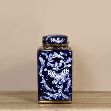كلاسيكية، ومثيرة، ومميزة للغاية. تتميز هذه الجرة بزخارف على شكل فراشة، وتجمع بين اللونين الأزرق والأبيض مع لمسات باللون الذهبي تكمل رونقها. تأتيك بغطاء قابل للإزالة لسهولة استخدامها في أغراض التخزين إلى جانب كونها قطعة ديكور بديعة.