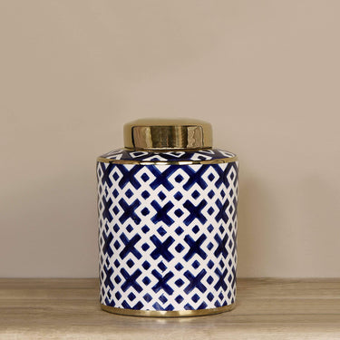قطعة لا مثيل لها للتعبير عن شخصيتك. تتميز هذه الجرة بزخارف باللون الأبيض والأزرق الداكن مع لمسات من اللون الذهبي وغطاء قابل للإزالة. إنها الإضافة المثالية إلى مطبخك أو غرفة معيشتك.