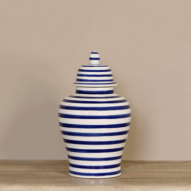أنيقة وكلاسيكية. هذه الجرة تتميز بتصميم رائع مع اللون الأبيض والزخارف على شكل خطوط زرقاء بديعة. كما أنها تأتيك بغطاء قابل للإزالة يجعلها عملية للغاية في أغراض التخزين.