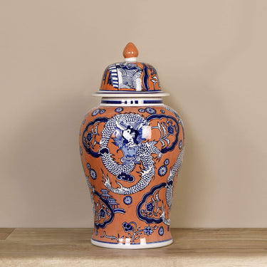 تصميم جريء وكلاسيكي في الوقت نفسه. تتميز هذه المزهرية بزخارف على شكل تنين مستوحاة من الطراز الآسيوي بألوان الأزرق والأبيض والبرتقالي الزاهية، مع غطاء زينة قابل للإزالة.
