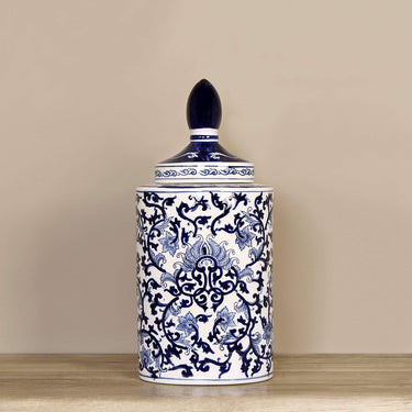 تصميم كلاسيكي مع لمسة إضافية من الرقي والفخامة. تتميز هذه الجرة بزخارف زهرية بديعة باللون الأبيض والأزرق، كما تشتمل على ذراع وغطاء قابل للإزالة لتحقيق أقصى قدر من العملية.