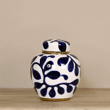 حيوية وعصرية. هذه الجرة البيضاء الأنيقة تتميز بزخارف من اللون الأزرق الداكن على شكل نبات متسلق، مع لمسات ذهبية ومساحة تخزين كبيرة أسفل غطاء قابل للإزالة.
