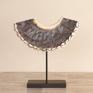 قطعة فريدة من صميم الفن القبلي البديع. تتميز بتصميم كردان تقليدي مزين بصدف حقيقي، ومثبت على قاعدة سوداء متينة.