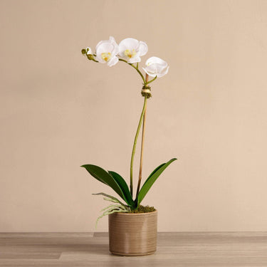 تشكيلة زهور الأوركيد الصناعية الرقيقة من بلومر مصممة خصيصاً لتخلق هالة من الهدوء والصفاء، مع زهور الأوركيد ناصعة البياض، والأوراق الخضراء التي تبعث على الراحة، نابعة من مزهريتها السيراميكية بتدرجات اللون البني، لتخلصك من التوتر والضغوط اليومية. يمكنك وضع هذه التشكيلة على طاولة ركنية إلى جانب مصباح في حمامك، أو مكانك المفضل للاسترخاء في المنزل. زهور الأوركيد تصنع من أجود الخامات على أيدي منسقي زهور متخصصين بحسب الطلب، وتتميز بمظهر وملمس مماثلين للزهور الطبيعية.