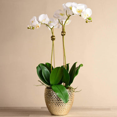 تشكيلة الفردوس من بلومر تجمع بين الطراز العصري والذوق الملكي الرفيع في تشكيلة من زهور الأوركيد الصناعية البديعة مجتمعة داخل مزهرية ذهبية على شكل أناناسة، لتضفي على منزلك لمسة أنيقة وغير متكلفة. يمكنك استخدام هذه التشكيلة في تزيين الحمام، أو غرفة المعيشة، أو ردهة منزلك، ليتلقى ضيوفك ترحيباً مثالياً. زهورنا تصنع من أجود الخامات، على أيدي منسقي زهور متخصصين بحسب الطلب، وتتميز بلمس ومظهر مماثلين للزهور الطبيعية.