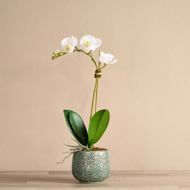 تتميز تشكيلة زهور الأوركيد المراكشية من بلومر بتصميم عصري مستوحى من سحر مدينة مراكش المغربية، مع زهور الأوركيد البيضاء البديعة، والأصيص السيراميكي باللون الأزرق المخضر على الطراز المغربي، لمظهر فريد يشعرك أنك بين الرمال الذهبية والسماء الزرقاء الصافية في المغرب. هذه التشكيلة يصنعها منسقي زهورنا المتخصصين من أجود الخامات بحسب الطلب، وهي متاحة بثلاثة أحجام.