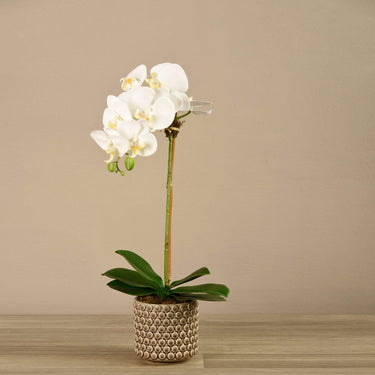 منسم ومتطور. يبدو ترتيب الأوركيد الاصطناعي هذا ويشعر بأنه حقيقي بشكل ملحوظ بفضل تقنية اللمس الحقيقي. وعاءها البيج الأنيق يجعل الأوراق الخضراء وبتلات الحرير تبرز حقًا.